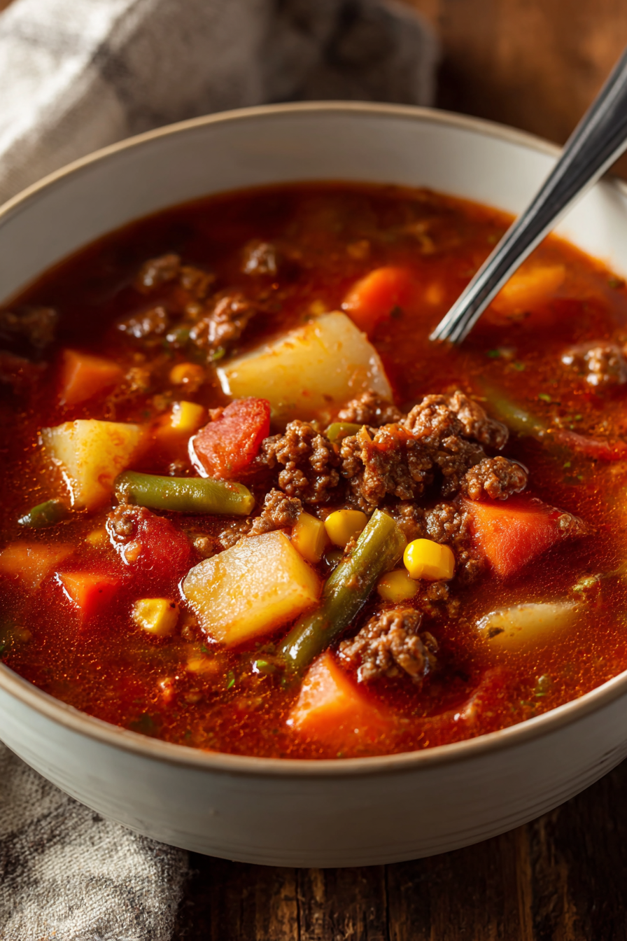 Regrese la cacerola a la estufa a fuego medio-alto. Agregue las zanahorias, el apio, el caldo de res, los tomates enlatados, las papas, las judías verdes, la pasta de tomate, la salsa Worcestershire, el condimento italiano, la sal y la pimienta. Revuelva todo y luego hierva. Una vez que hierva, reduzca el fuego a bajo, tape y cocine a fuego lento durante unos 25 minutos, o hasta que las papas y las verduras estén tiernas.